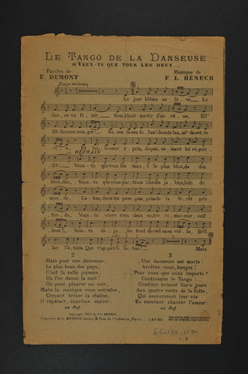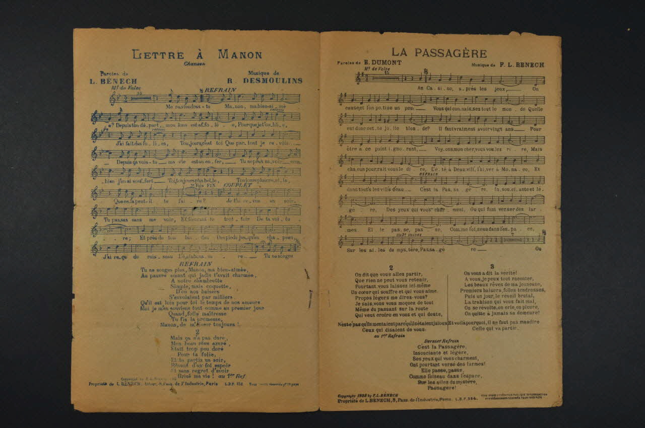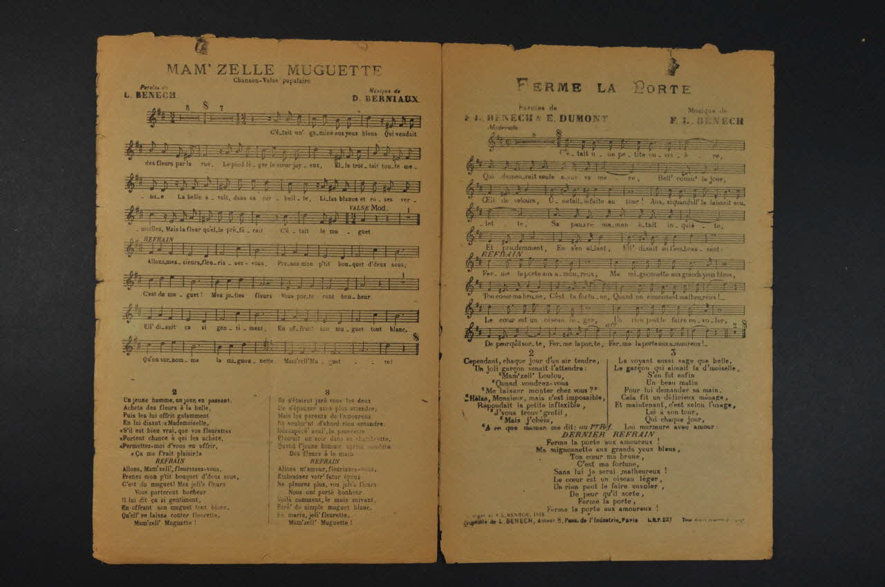 Les inscriptions renseignent le titre de la chanson, le nom des auteurs, de l'artiste et de l'éditeur. A l'intérieur et au dos partitions et paroles de la chanson.Décor