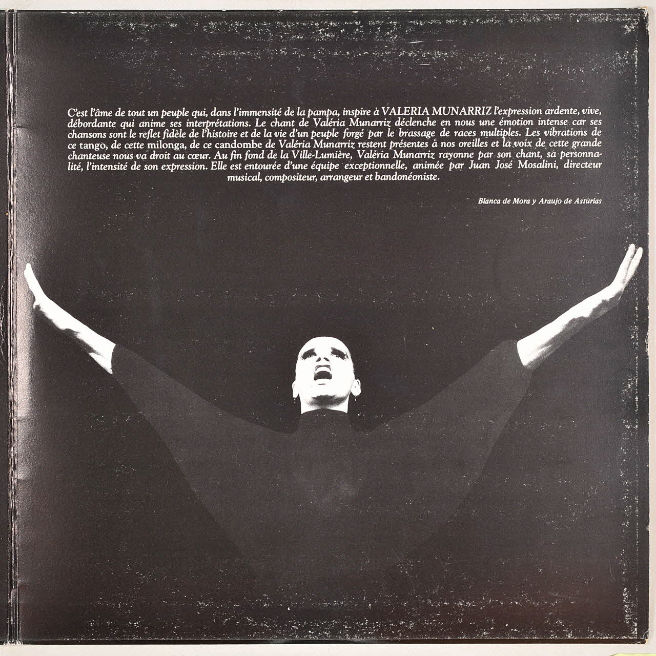 Le verso de la pochette présente sur un fond noir la même ligne ondulée La pochette s'ouvre dans le sens horizontal. A l'intérieur sont sur un fond noir à gauche dans un cadre blanc la liste des titres de l'album et à droite sous un texte de présentation de Blanca de Mora y Araujo de Asturias une photographie de Valeria Munarriz les bras tendus et levés. A l'intérieur de la pochette se trouve une pochette en papier blanc présentant les textes des chansons en français et en espagnol. L'étiquette au centre du disque présente un fond gris sur lequel sont inscrits les titres et le logo de l'éditeur.Inscriptions
