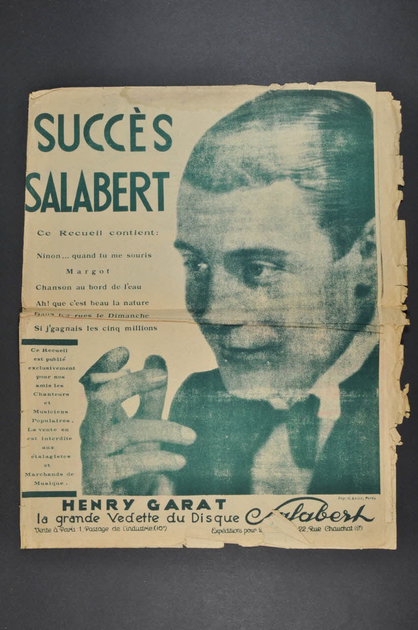 Feuillet rectangulaire en papier industriel, imprimé à l?encre verte (sauf l?intérieur à l?encre noire). La couverture du feuillet présente la photographie de Henry Garat.