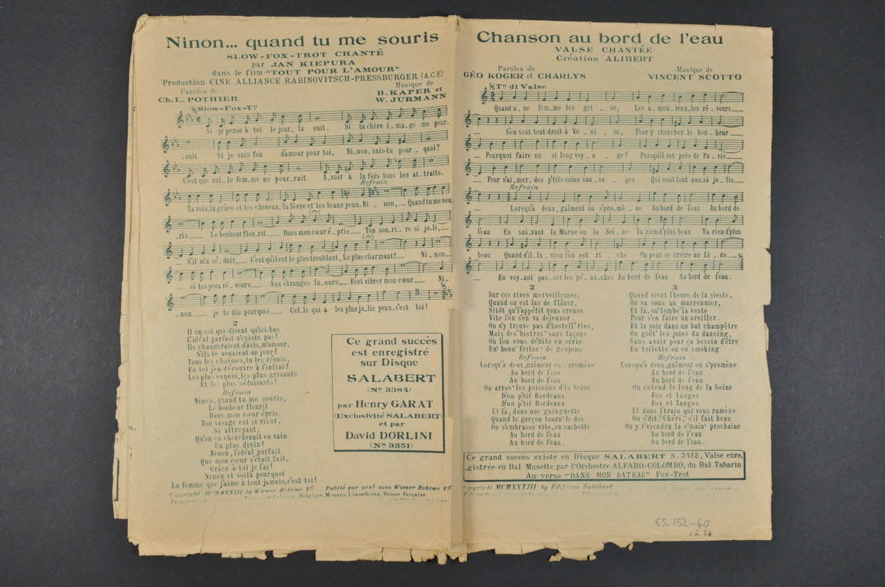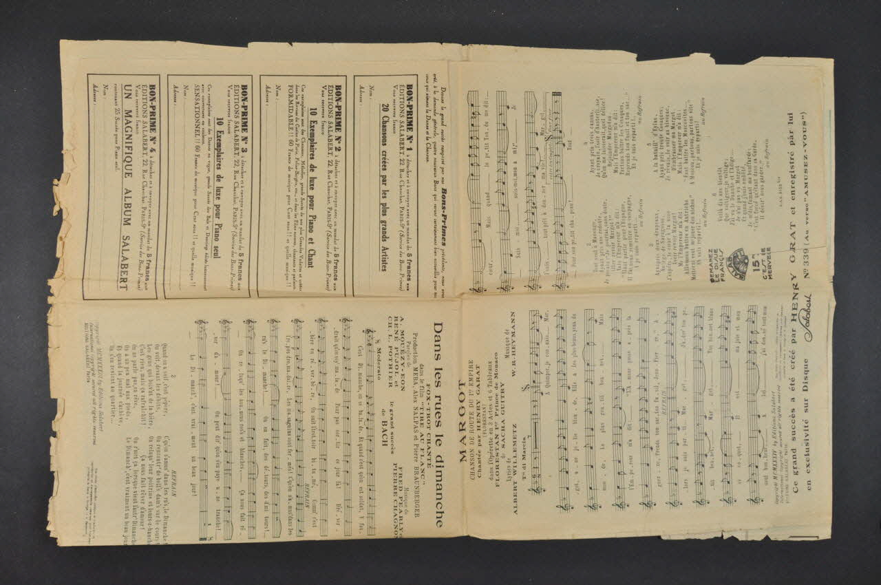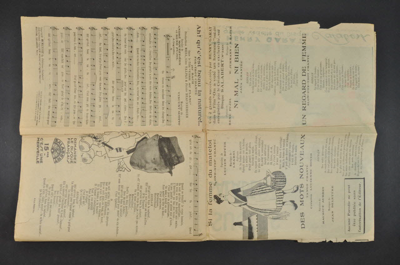 Les inscriptions renseignent le titre de la chanson, le nom des auteurs, de l'artiste et de l'éditeur. A l'intérieur et au dos se trouvent les partitions et paroles de la chanson.Décor