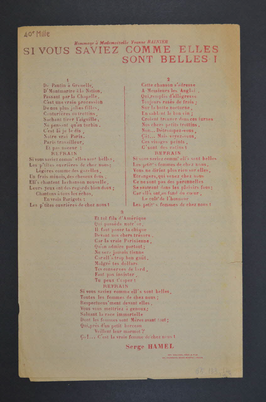 Feuillet rectangulaire en papier industriel imprimé. Le feuillet contient la partition et les paroles de la chanson. Au dos, publicité pour l'éditeur.