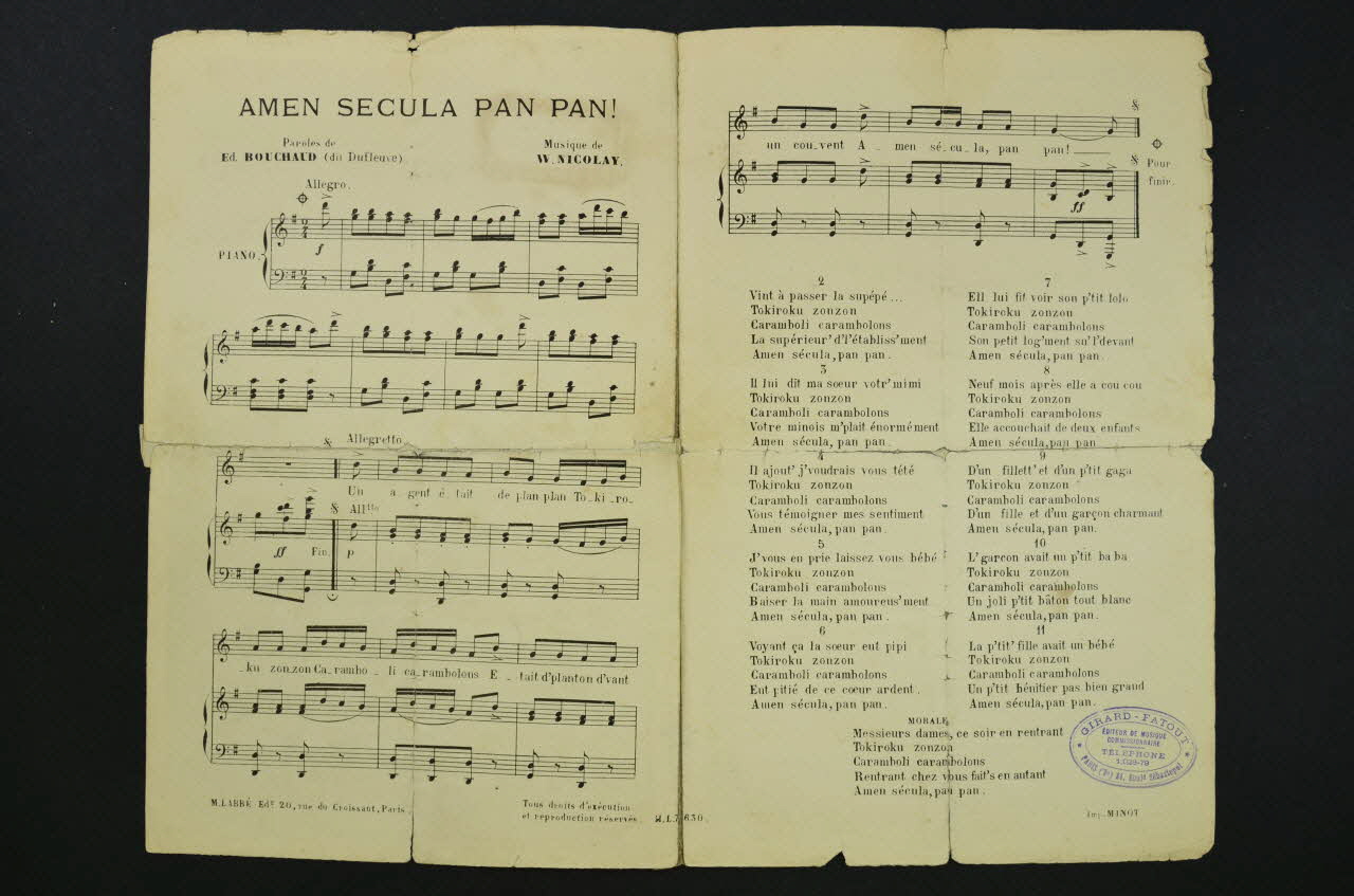GIRARD - FATOUT // EDITEUR DE MUSIQUE // COMMISSIONNAIRE // TELEPHONE // 1.028.79 // PARIS (3e) 84, Bould Sébastopol (Un tampon publicitaire circulaire à l'encre bleue dans l'angle inférieur droit de la troisième page.), intérieurDécor