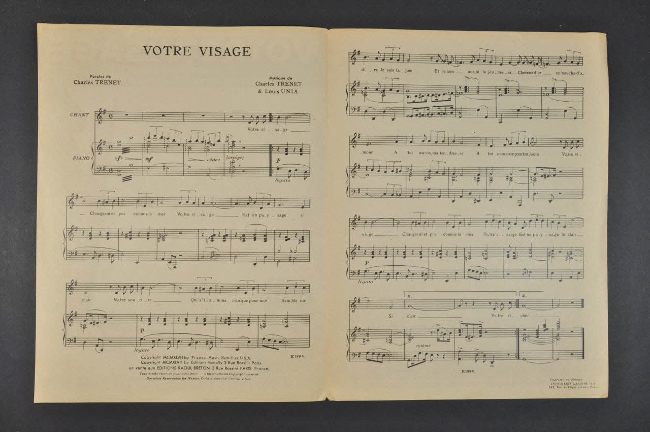 Les inscriptions renseignent le titre de la chanson, le nom des auteurs, de l'artiste et de l'éditeur. A l'intérieur, partitions et paroles de la chanson. Au dos, liste d?autres partitions publiées par l?éditeur.Décor