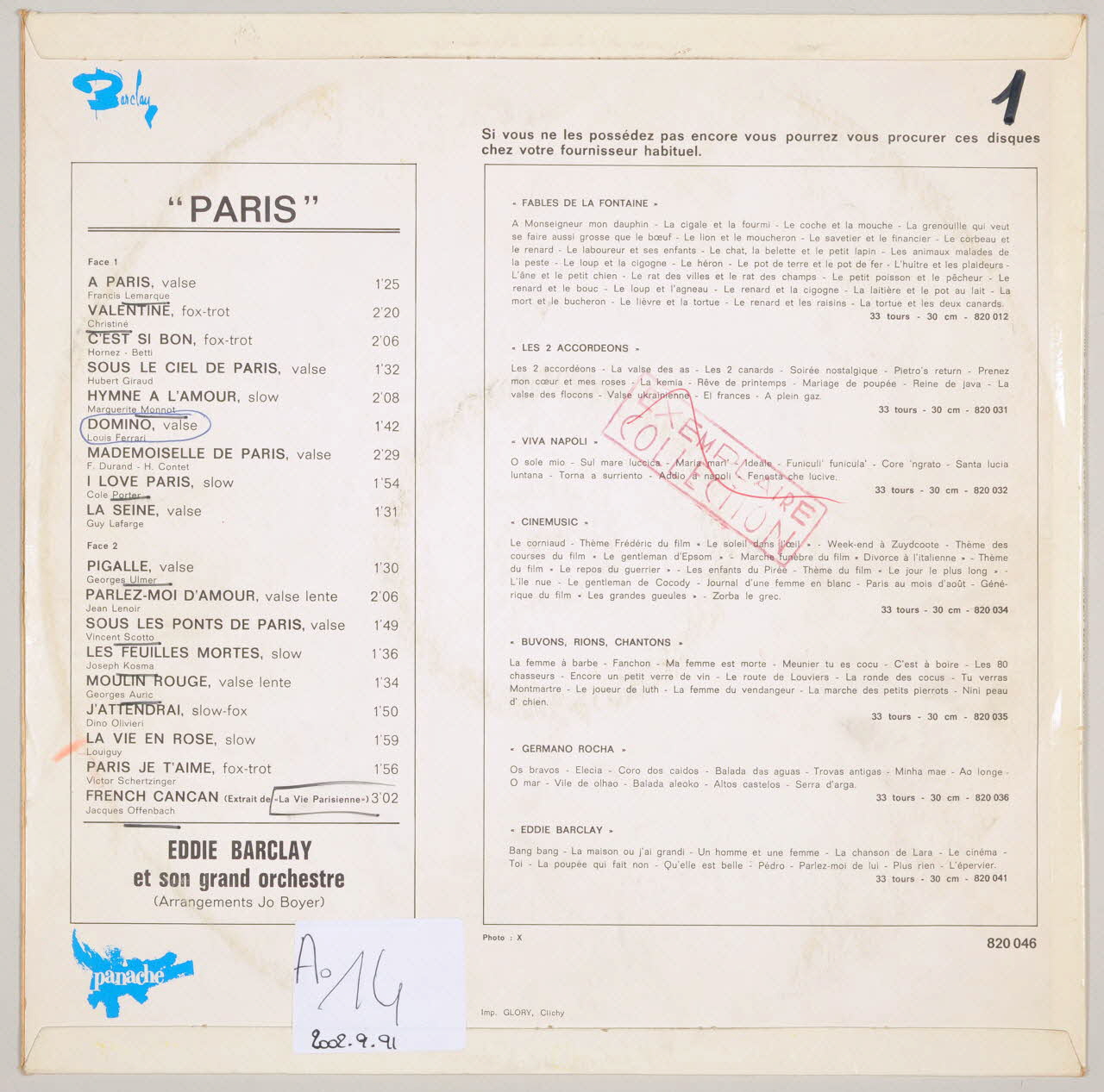 disque 33 tours, La Seine, Hymne à l'amour, Paris, J'attendrai, La vie en rose, Parlez-moi d'amour, Moulin Rouge, Sous le ciel de Paris, A Paris, Mademoiselle de Paris, Pigalle, French cancan, Les feuilles mortes, Sous les ponts de Paris, Domino, Valentine, Paris je t'aime, I love Paris, C'est si bon