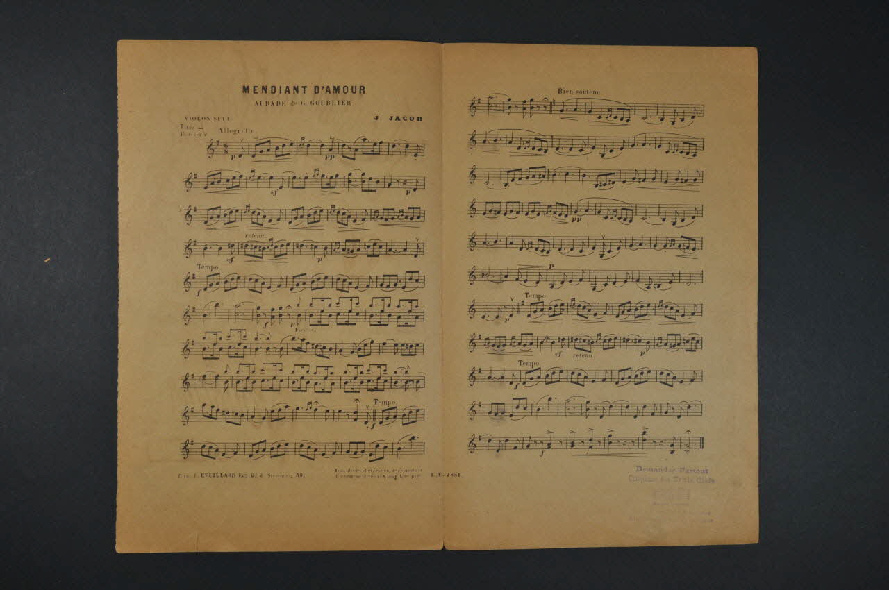 Les inscriptions renseignent le titre de la chanson, le nom des auteurs, de l'artiste et de l'éditeur. A l'intérieur, partitions et paroles de la chanson. Au dos, liste d?autres partitions publiées par l?éditeur.Matériaux et techniques