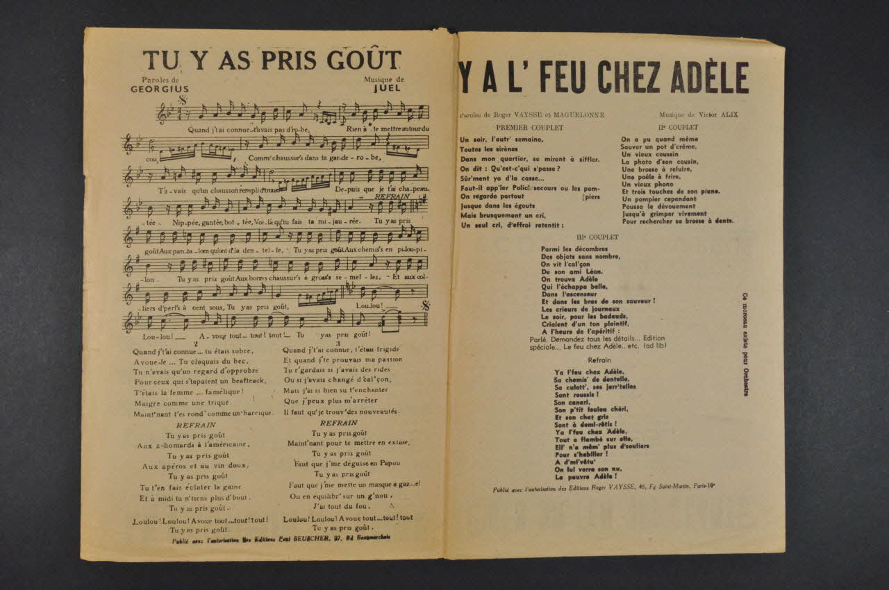 Feuillet rectangulaire en papier industriel imprimé à l'encre noire. Sur la couverture, la partition de la première chanson.