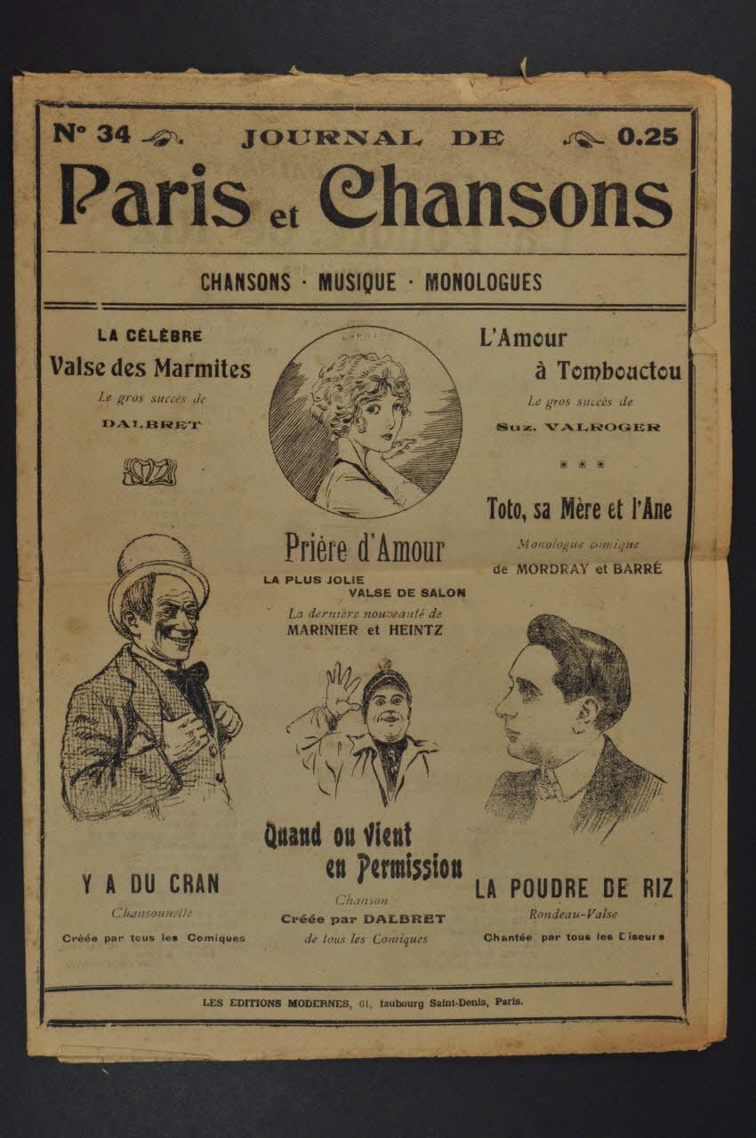 chanson, partition de musique, petit format, Toto, sa mère et l'âne, L'amour à Tombouctou, Journal de Paris et chansons, La poudre de riz, Prière d'amour, Quand on vient en permission, Y'a du cran, La valse des marmites