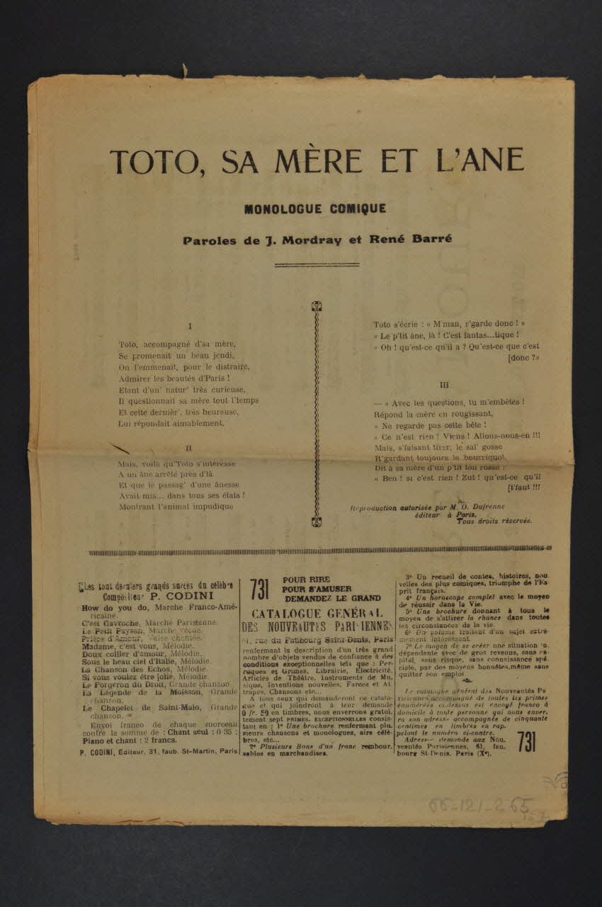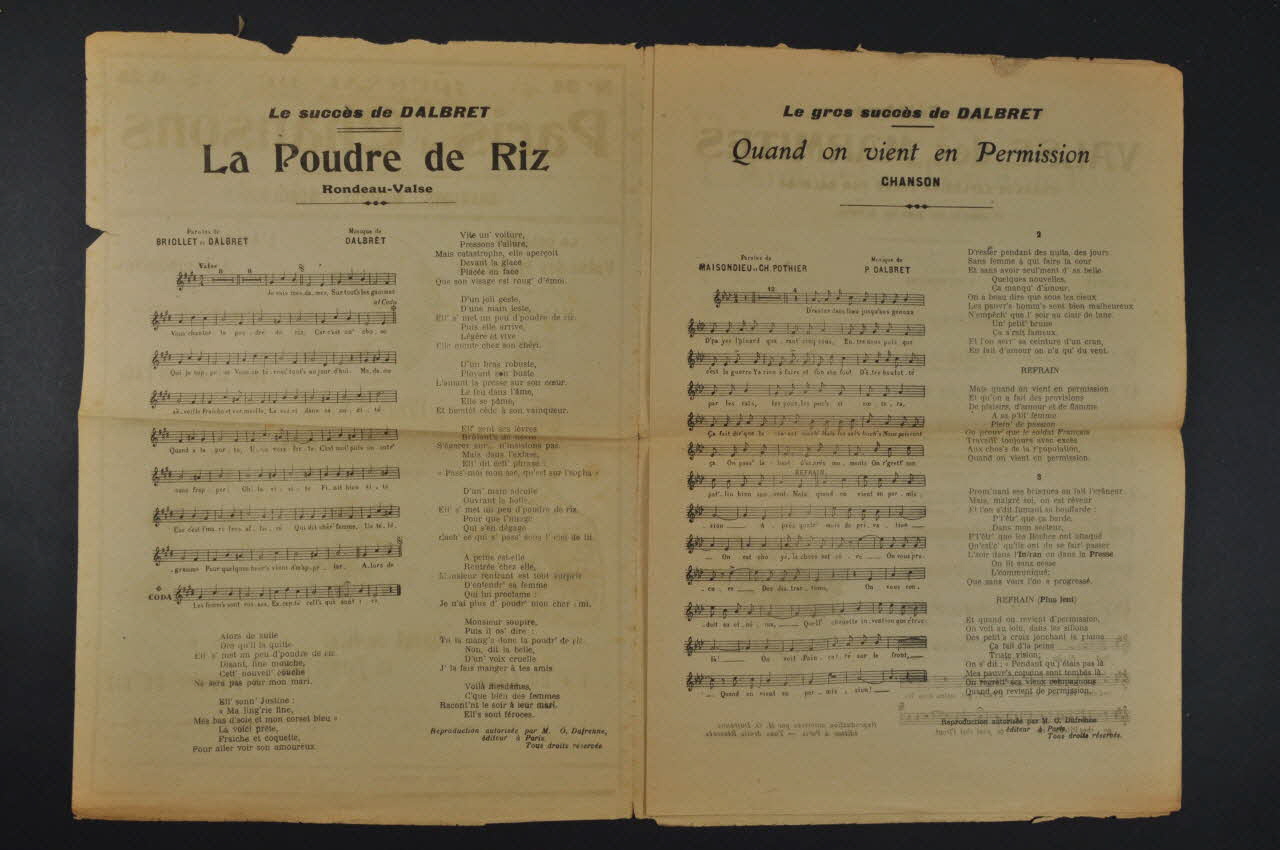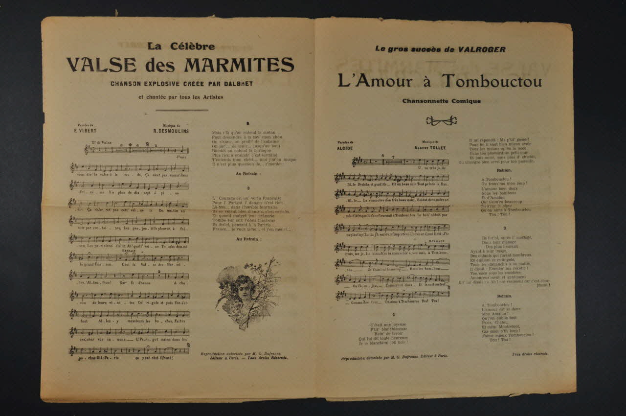 Les inscriptions renseignent le titre de la chanson, le nom des auteurs, de l'artiste et de l'éditeur. A l'intérieur et au dos, les partitions et les paroles des chansons.Décor