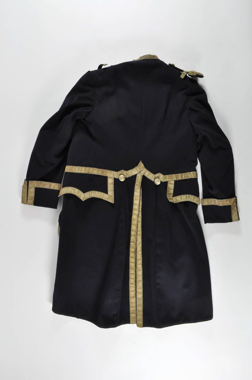 Redingote en drap de laine bleu à encolure pointue bordé d'un galon de passementerie se poursuivant le long de l'ouverture bordée de part et d'autre d'une rangée de cinq boutons décoratifs et cinq fausses boutonnières ; manches longues et ajustées à revers avec deux boutons et galon ; deux poches avec rabat à trois pointes bordé d'un galon ; épaules soulignées d'un galon avec épaulette trilobée rembourée et décorée d'un galon, attache par agrafes métalliques ; bas du dos fendu avec galon et deux boutons ; doublure en toile de coton matelassée au niveau du plastron.