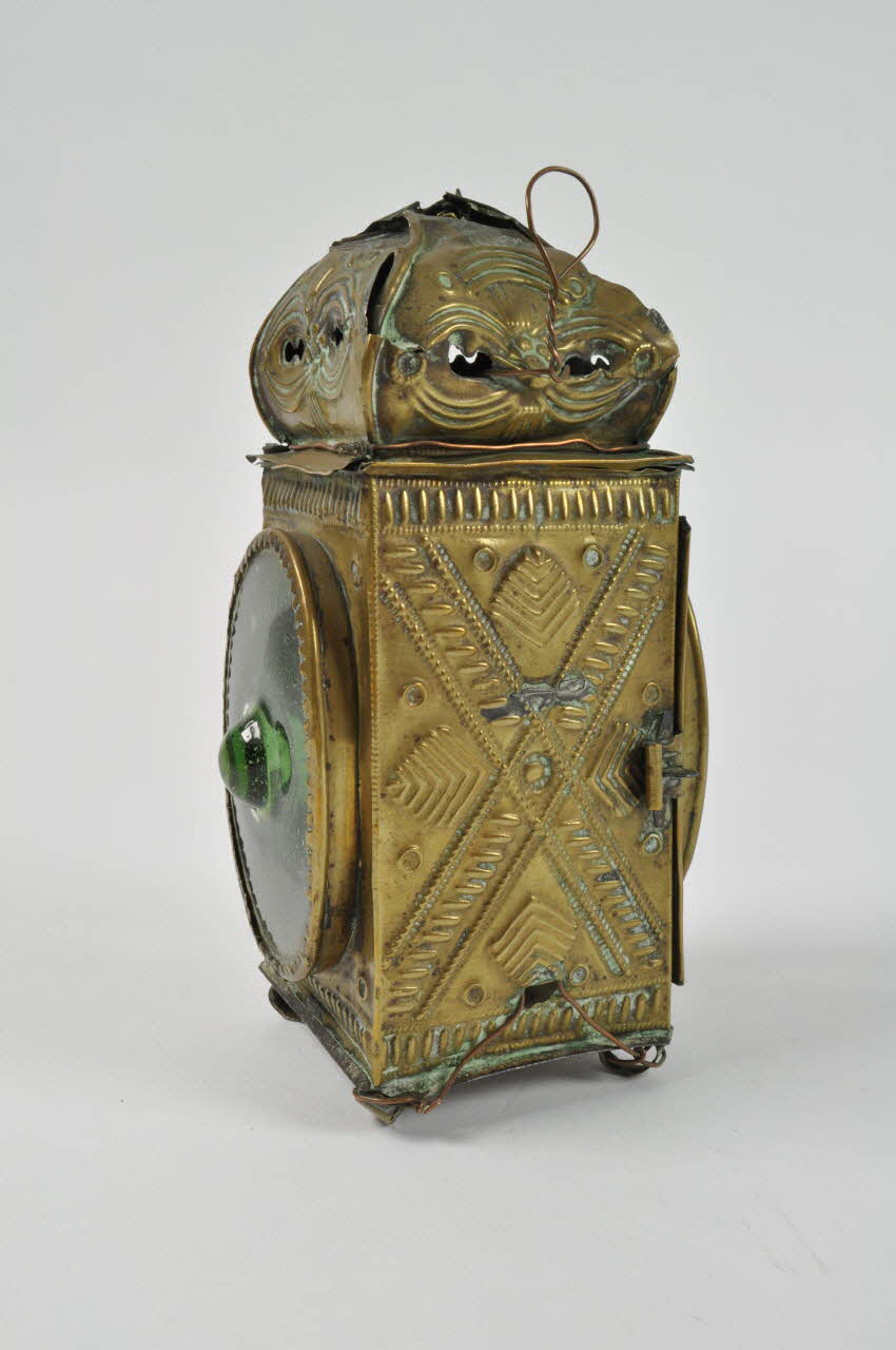Sur les deux autres faces : fenêtre ovale à verre vert avec pointe au milieu. La troisième fenêtre est vide, le morceau de verre se trouve à l'intérieur. Un pied pour fixer la bougie à l'intérieur. En partie supérieure décor en relief et ajours, en forme de toit. Fil de cuivre au sommet et sur les pieds.Décor