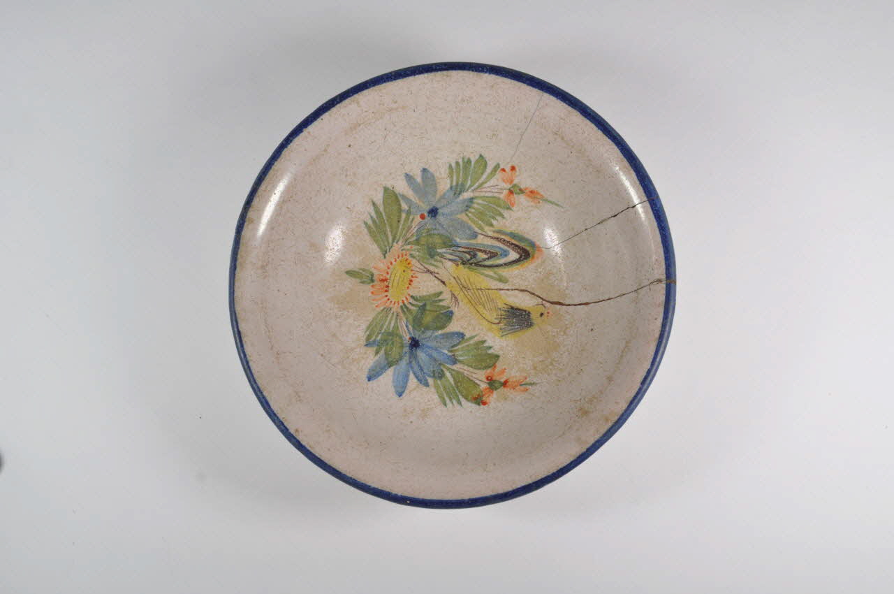 En faïence moulée ; de forme ronde, reposant sur un pied rond ; à bord haut évasé. L'ensemble est recouvert d'une glaçure blanche ; au fond est peint un coq au milieu de végétaux. Le pied est percé d'un trou dans lequel est passé une corde.Inscriptions