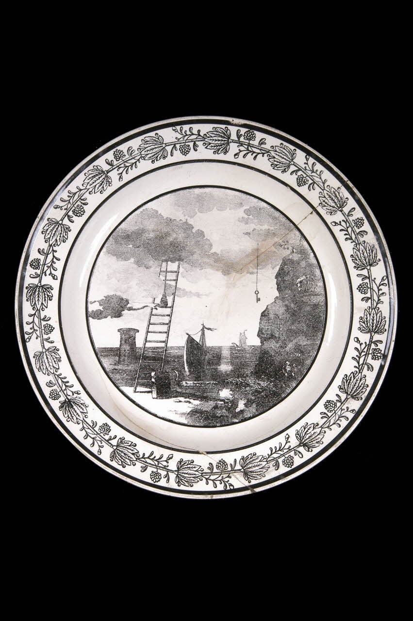 Cette assiette en faïence comporte un décor de couronne végétale sur sa bordure extérieure.