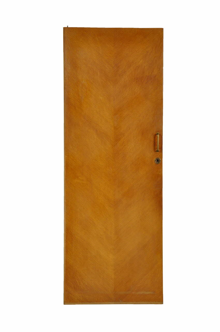 La planche de l'âme de la porte est en bois clair. Le plaquage de la face antérieure, plus foncé, est caractérisé un motif triangulaire, formé par deux bandes de plaquage parallèles et dont le sens du bois est descendant vers le centre de la porte.