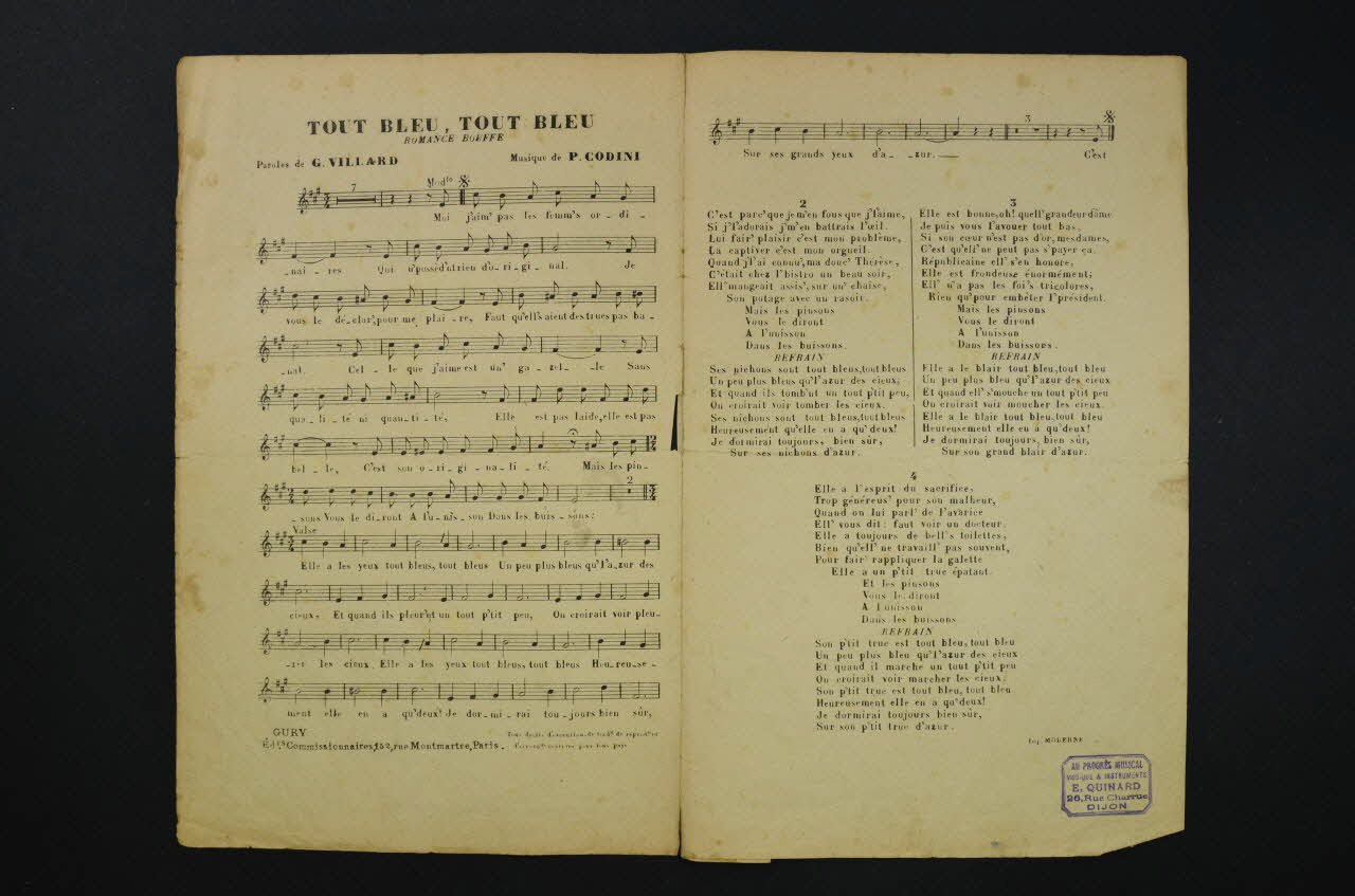A l'intérieur, partition et paroles de la chanson. Au dos, liste d?autres partitions publiées par l?éditeur.Matériaux et techniques