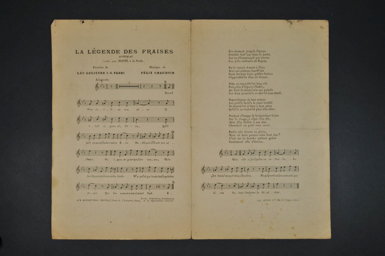 Sur la couverture, le portrait dessiné de Mayol, en buste. Les inscriptions renseignent le titre de la chanson, le nom des auteurs, de l'artiste et de l'éditeur. A l'intérieur, partition et paroles de la chanson. Au dos, liste d'autres partitions publiées par l'éditeur.Matériaux et techniques