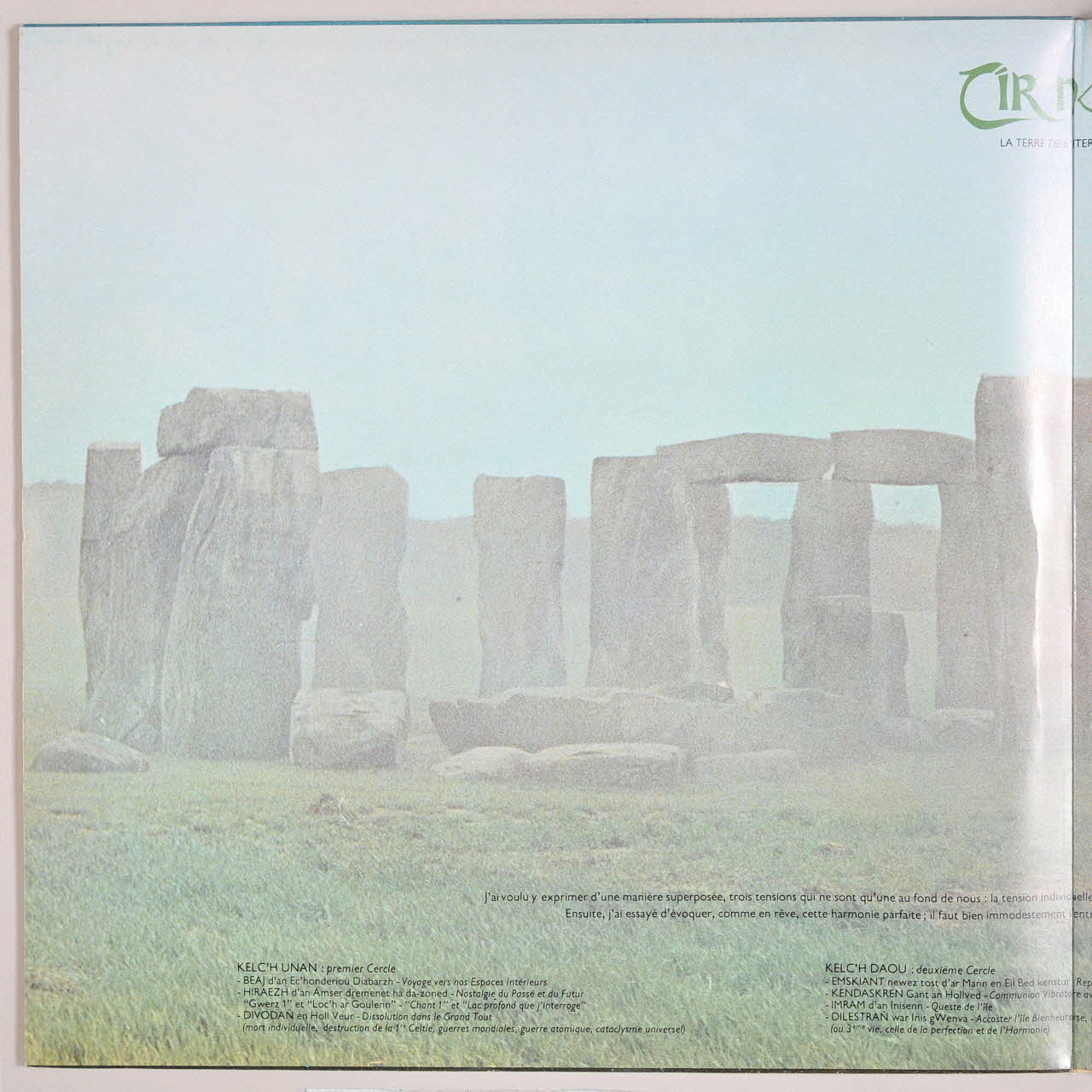 Au verso, une photographie de Monsieur Alan Stivell. A l'intérieur de la pochette, une photographie couleur du site de Stone Edge. Un petit livret en papier fournit des explications sur la thématique du disque. Des inscriptions sur les deux faces de la pochette et sur l'étiquette des deux disques renseignent les titres et les exécutants de l'album.Décor