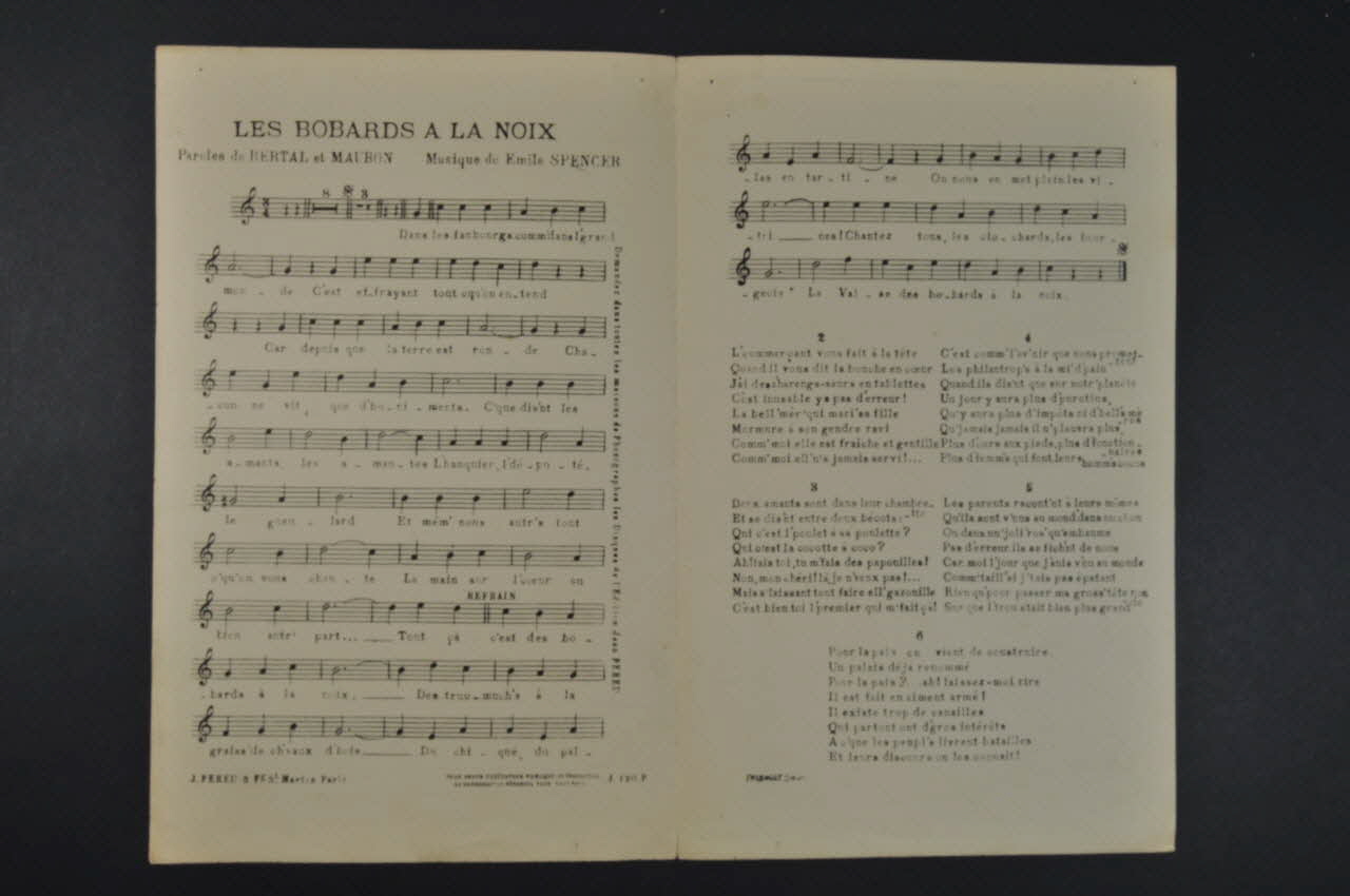 Les inscriptions renseignent le titre de la chanson, le nom des auteurs, de l'artiste et de l'éditeur. A l'intérieur, partitions et paroles de la chanson. Au dos, liste d?autres partitions publiées par l?éditeur.Décor