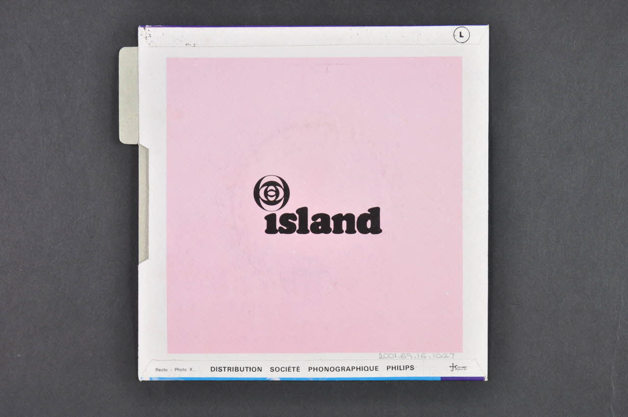Au recto figurent le nom du groupe, le titre des chansons et le logo de l'éditeur en haut et en bas. Au centre, une photographie bleue montre les membres du groupe sur un fond violet. Un onglet bleu contenant des inscriptions noires se trouve dans le coin supérieur droit. Le verso comporte le logo de l'éditeur en noir sur un fond rose bordé de blanc.Matériaux et techniques