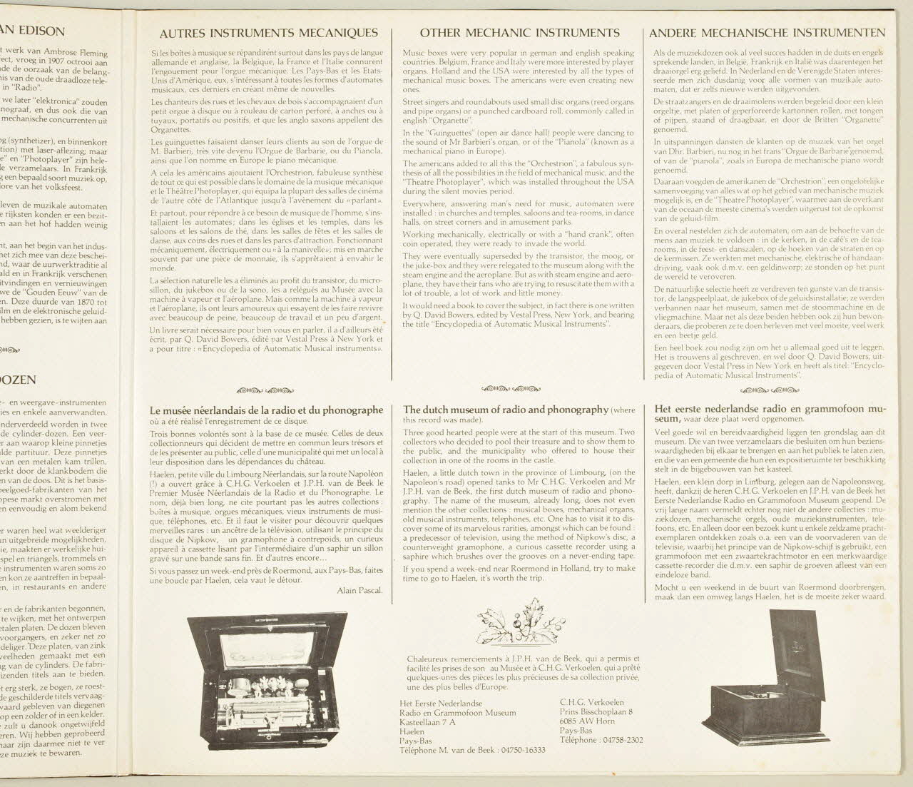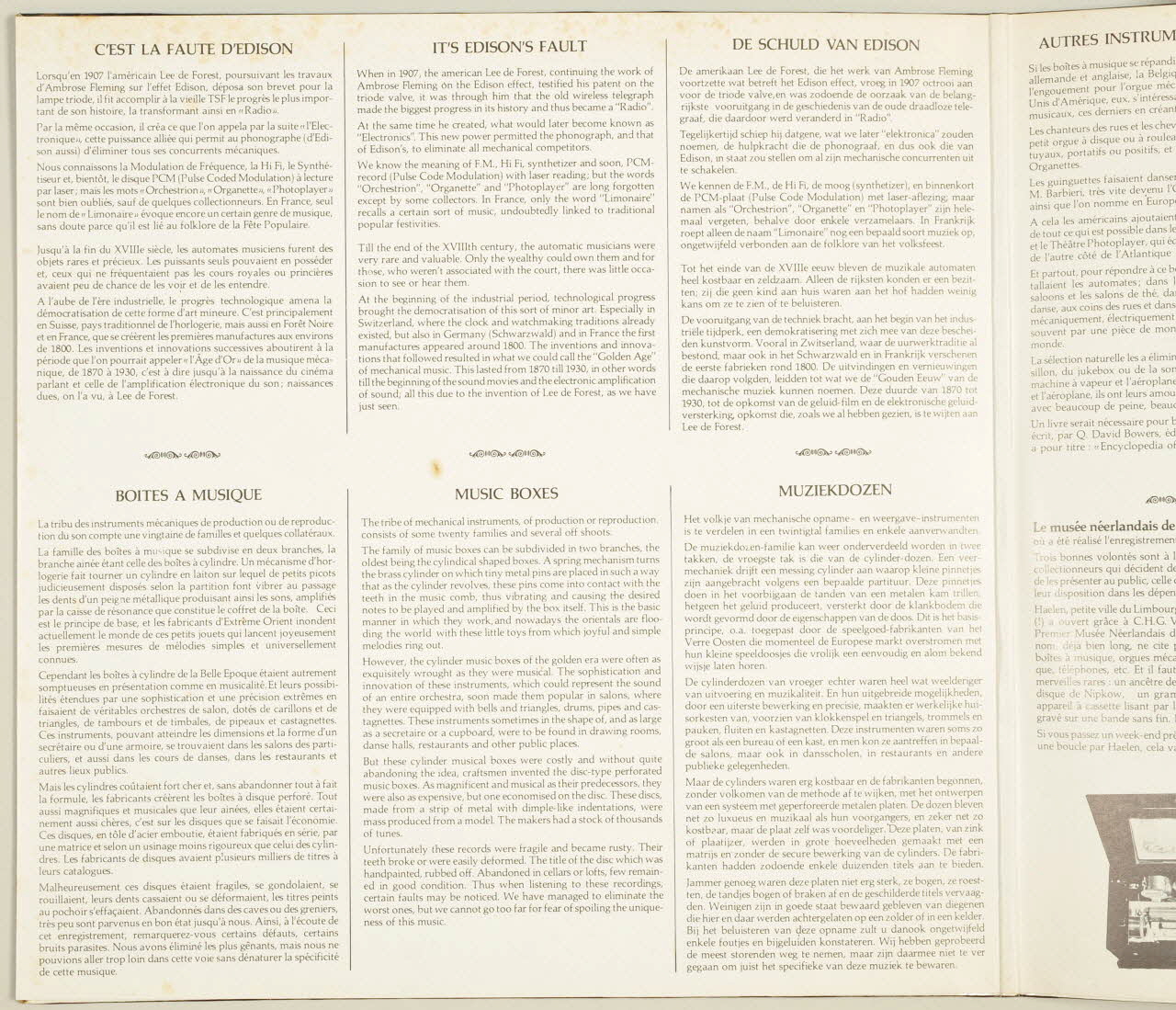 A l'intérieur de la pochette, des textes explicatifs en trois langues (allemand, français, anglais) illustrés de photographies. Les indications relatives aux titres, auteurs, exécutants et éditeur sont présentes sur les deux faces de la pochette et sur l'étiquette orange du disque.Matériaux et techniques