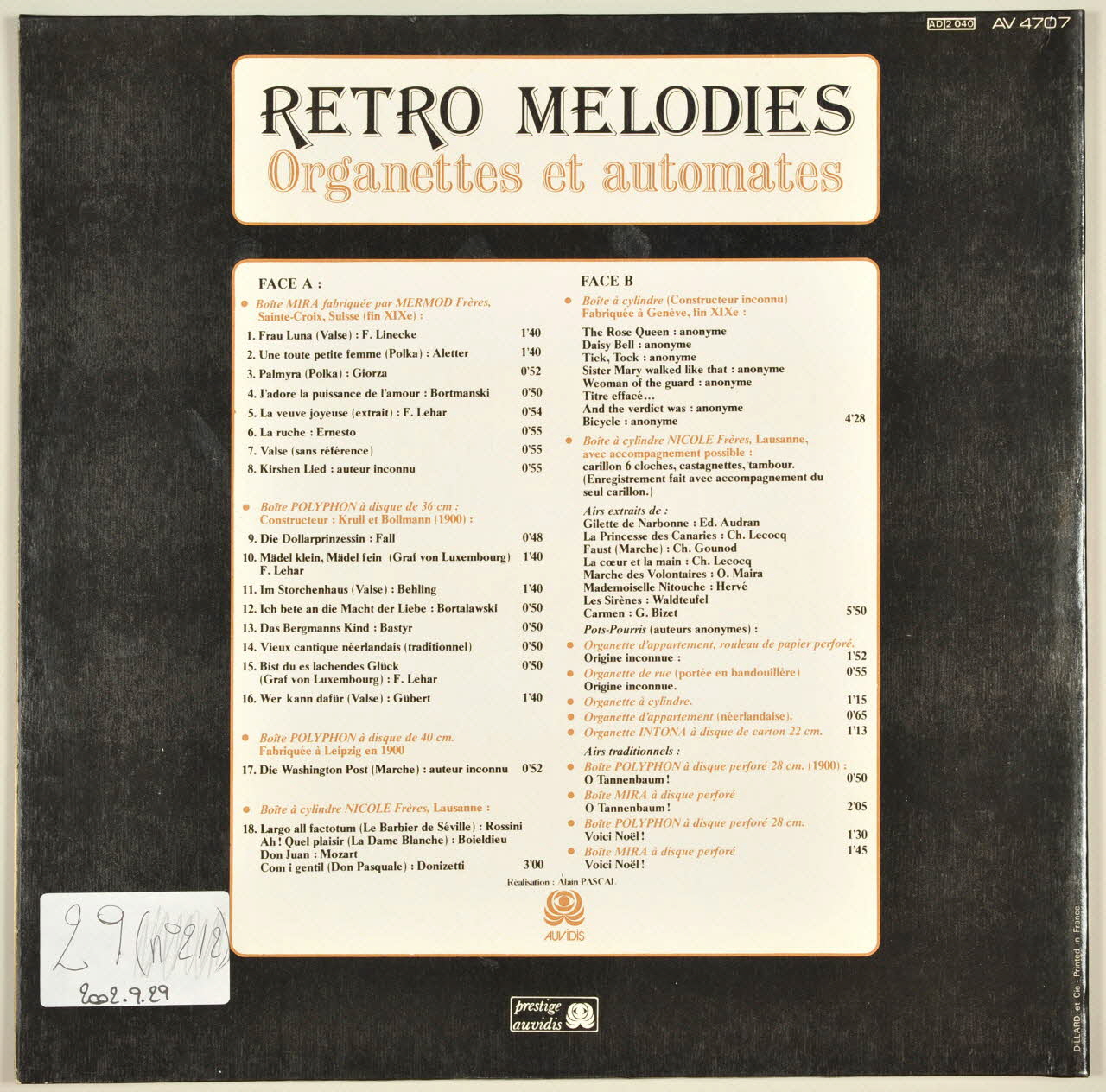 disque 33 tours, Faust, Le coeur et la main, Don Juan, La veuve joyeuse, Sister Mary walked like that, Wer kann dafür, Retro Melodies, Die Washington Post, Gillette de Narbonne, Bist du es lachendes Glück, Tick, tock, Weoman of the guard, And the verdict was, Das Bergmanns Kind, Ah! quel plaisir, Daisy Bell, Die Dollarprinzessin, La princesse des Canaries, Mademoiselle Nitouche, Mädel klein, Mädel fein, Com i gentil, The Rose Queen, Ich bete an die Macht der liebe, Bicycle, J'adore la puissance de l'amour, Voici Noël !, Les sirènes, Frau Luna, Kirshen lied, Im Storchenhaus, Vieux cantique néerlandais, O Tannenbaum !, La ruche, Une toute petite femme, Marche des volontaires, Carmen, Largo all factotum, Palmyra