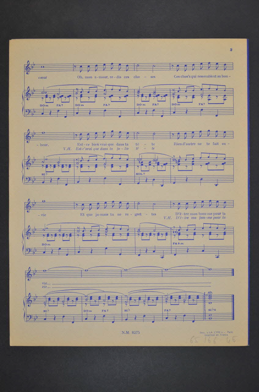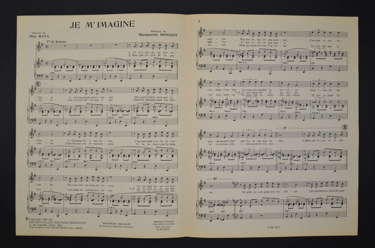 Les inscriptions précisent l'auteur de la chanson, les interprètes et l'éditeur du feuillet. L'intérieur comporte la partition et les paroles. Au dos, une liste d'autres titres disponibles chez le même éditeur.Décor