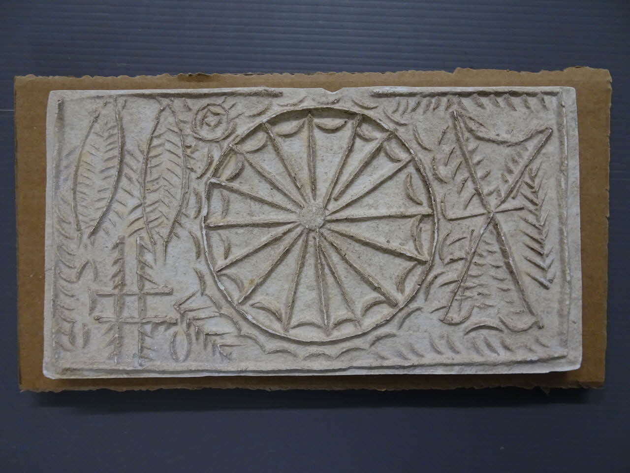 -roue au centre, 2 faux croisées... - un personnage, un soleil...Matériaux et techniques