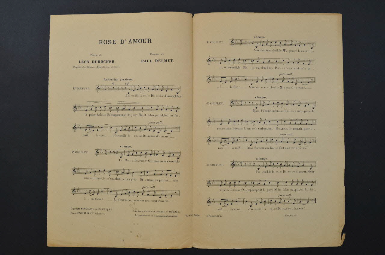 papier imprimé / Feuillet rectangulaire en papier industriel imprimé à l'encre. L'intérieur comporte les paroles et la partition de la chanson. Au dos, publicité pour l'éditeurMatériaux et techniques