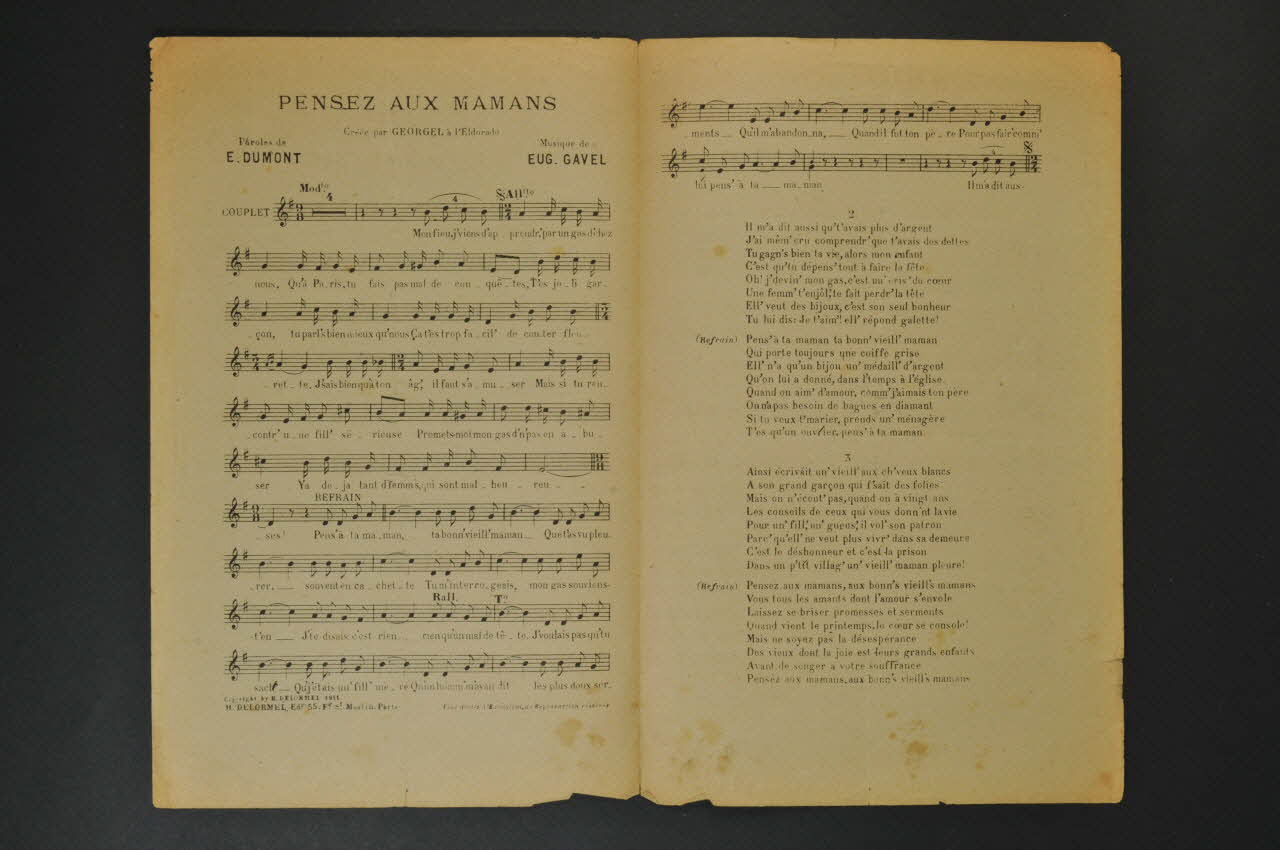 Les inscriptions renseignent le titre de la chanson, le nom des auteurs, de l'artiste et de l'éditeur. A l'intérieur, partitions et paroles de la chanson. Au dos, liste d?autres partitions publiées par l?éditeur.Matériaux et techniques