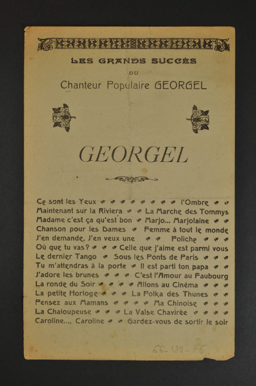 Feuillet rectangulaire en papier industriel, imprimé à l?encre noire. La couverture du feuillet présente la photographie de Georgel.