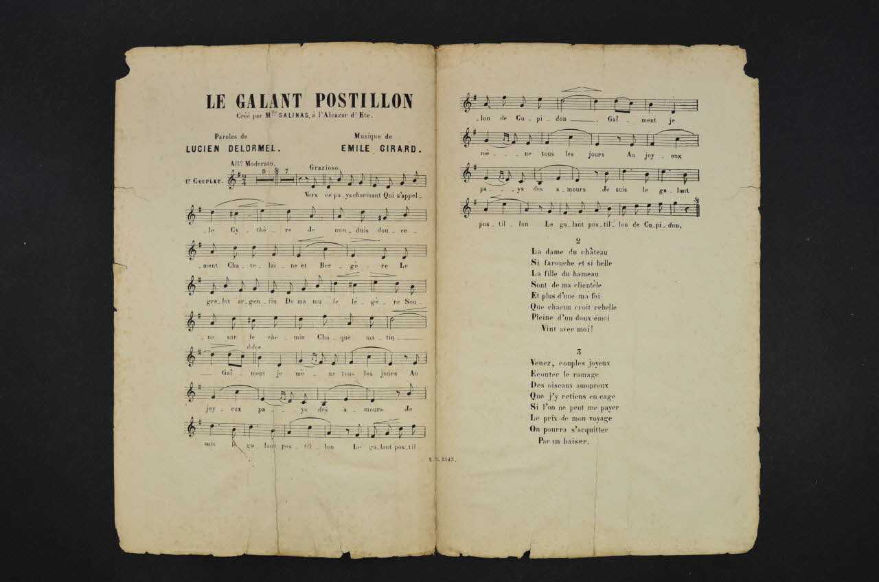 Les inscriptions renseignent le titre de la chanson, le nom des auteurs, de l'artiste et de l'éditeur. A l'intérieur, la partition et les paroles. Le dos est laissé vierge.Décor