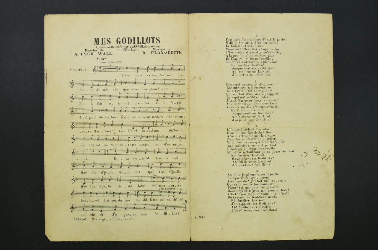 Sur la couverture, une caricature : caporal-sapeur rapportant au fusilier Lasticot sa paire de godillots, les sortant dégoulinantes de sa gamelle. Les inscriptions renseignent le titre de la chanson, le nom des auteurs, de l'artiste et de l'éditeur. A l'intérieur, partition et paroles de la chanson. Le dos est laissé vierge.Décor