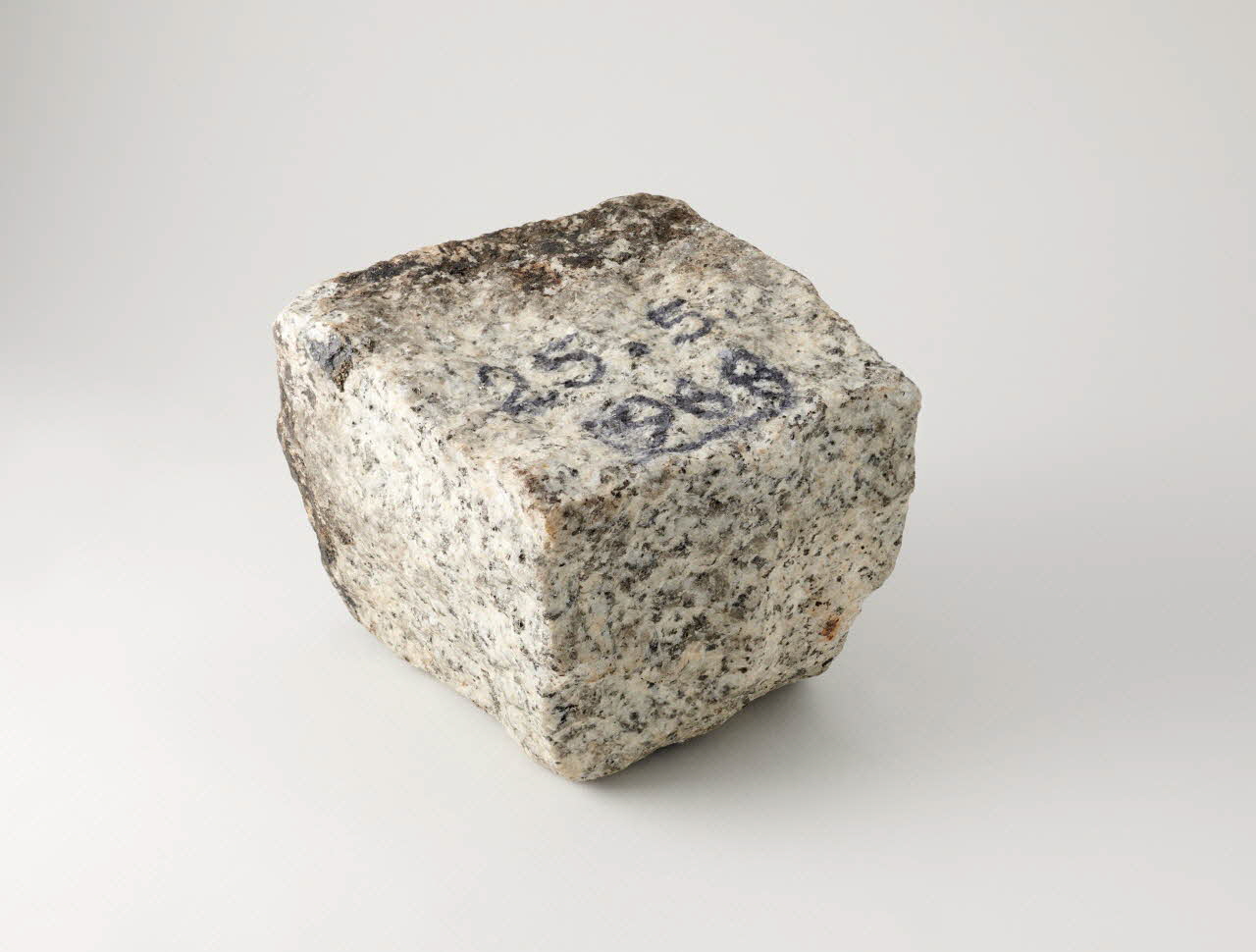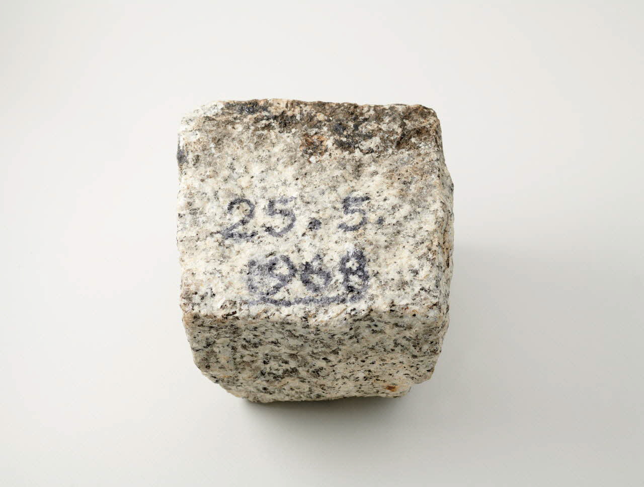 Pavé en granit blanc et gris, portant une inscription tracée sur une face mentionnant la date du 25 mai 1968. Aspect noirâtre de la partie plate.Décor