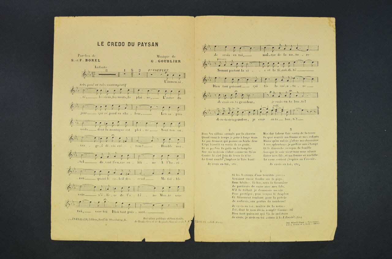 Feuillet rectangulaire imprimé sur papier industriel à l'encre noire. La première page présente le dessin d'un paysan faisant une prière dans un champ.