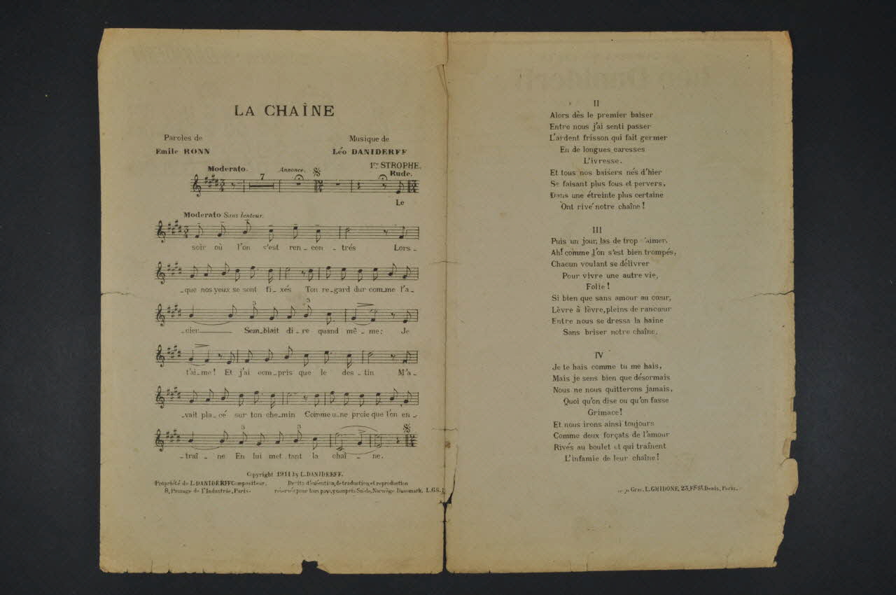 Des inscriptions renseignent le titre, les auteurs, les exécutants et l'éditeur. A l'intérieur, partition et paroles de la chanson. Au dos, liste d'autres partitions publiées par l'éditeur.Décor