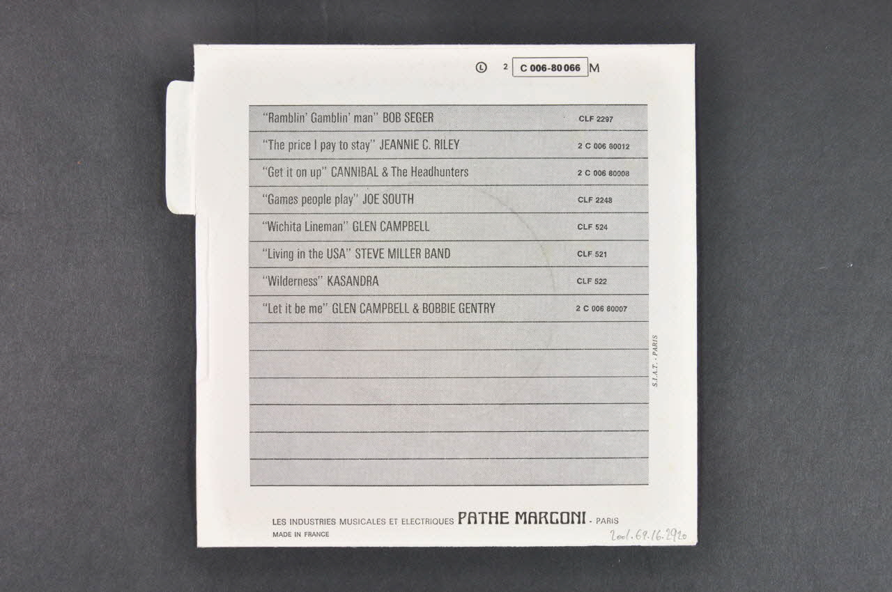 Pochette de disque de forme carrée, en papier plié et collé. Le recto présente à la fois du texte (nom de l'artiste, titre des morceaux...) en rouge sur blanc et en blanc sur noir ainsi qu'une illustration (dessin en noir et blanc d'un homme de profil). Une languette est présente sur le bord supérieur droit, elle laisse apparaître le nom de l'artiste en noir sur blanc. Le verso présente en noir sur gris les titres des morceaux et les références d'opus d'artistes produits par la maison de disques.Matériaux et techniques