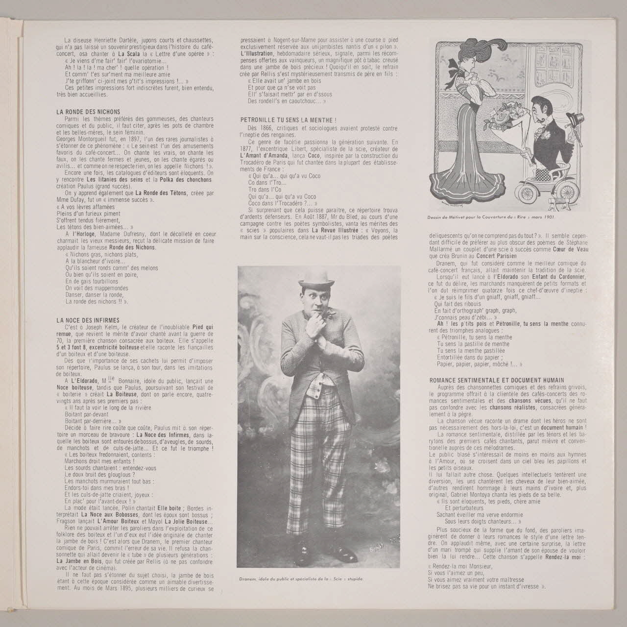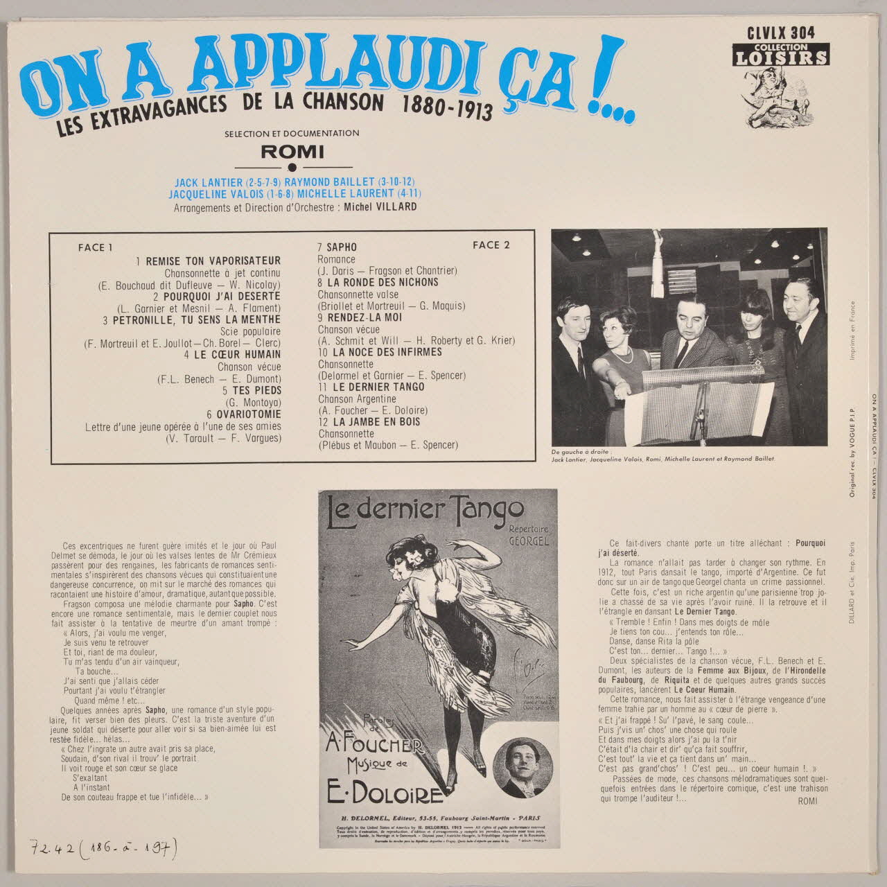 disque 33 tours, Le coeur humain, Rendez-la moi, Remise ton vaporisateur, Tes pieds, Sapho, La noce des infirmes, On a applaudi ça !, La jambe en bois, Ovariotomie, Pourquoi j'ai déserté, La ronde des nichons, Le dernier tango, Pétronille, tu sens la menthe
