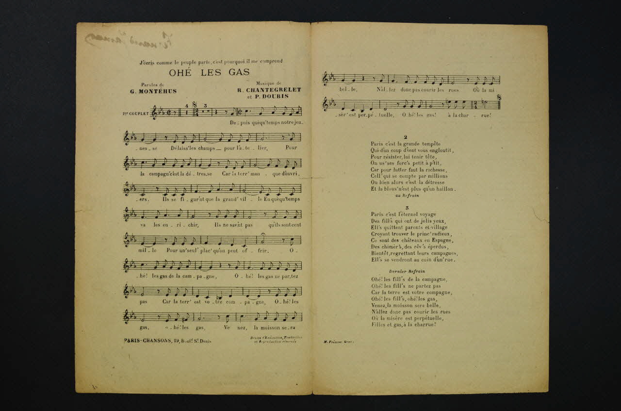 Les inscriptions renseignent le titre de la chanson, le nom des auteurs, de l'artiste et de l'éditeur. A l'intérieur, partition et paroles de la chanson. Au dos, liste d?autres partitions publiées par l?éditeur.Décor