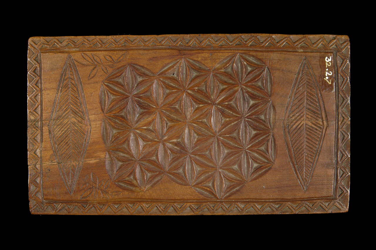 Bois taillé / Rectangulaire. Décor géométrique. Hexagone sème de rosaces, 2 cercles concentriques, 2 rosaces à branches courbes, 2 croix de Malte, encadrement sur trois côtes dents de scie. Sur l'autre côté motifs avec semis de rosaces à 6 feuilles, de losanges avec arètes de poisson, 2 rameaux de feuilles, encadrement dents de scieDécor