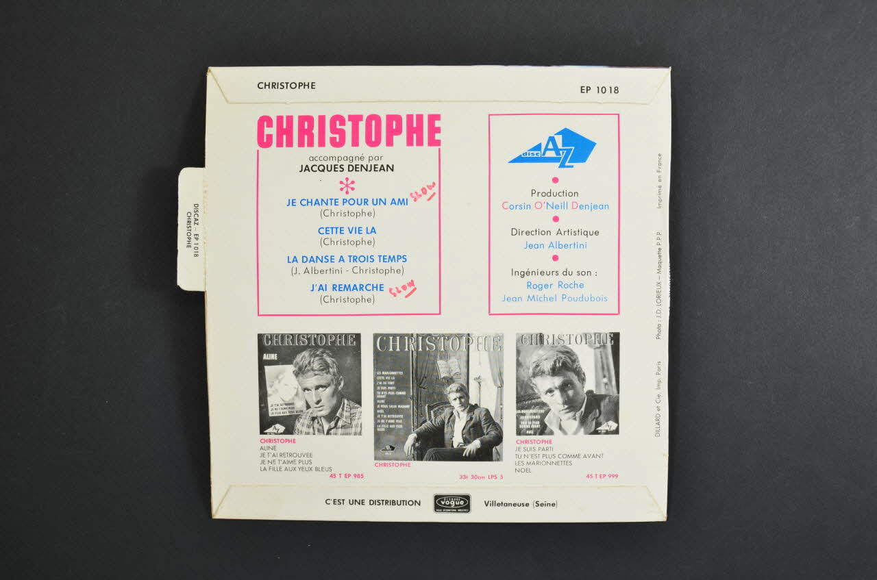 Au verso, le fond est blanc avec des inscriptions noires et roses. En bas, figurent trois photos en noir et blanc de pochettes de disque.