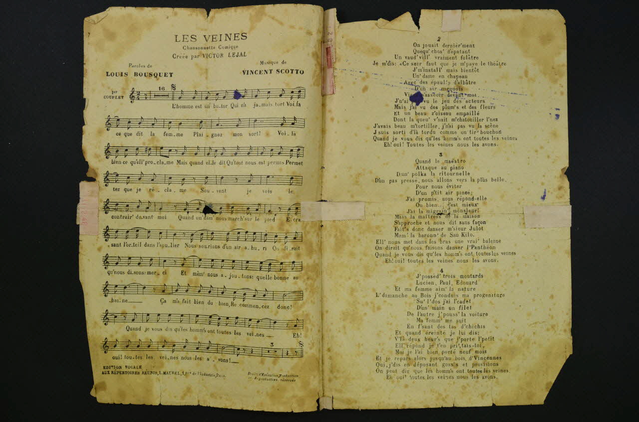 La couverture du feuillet présente le portrait photographique de Victor Lejal. Les inscriptions renseignent le titre de la chanson, le nom des auteurs, de l'artiste et de l'éditeur. A droite du portrait, une liste d'autres titres de Lejal. Plusieurs dépots de papier encollé rose sur les zones fragilisées ou déchirées, suite à une réparation antérieure. A l'intérieur, partition et paroles de la chanson. Au dos, liste d'autres partitions du répertoire Lejal publiées par l'éditeur.Décor