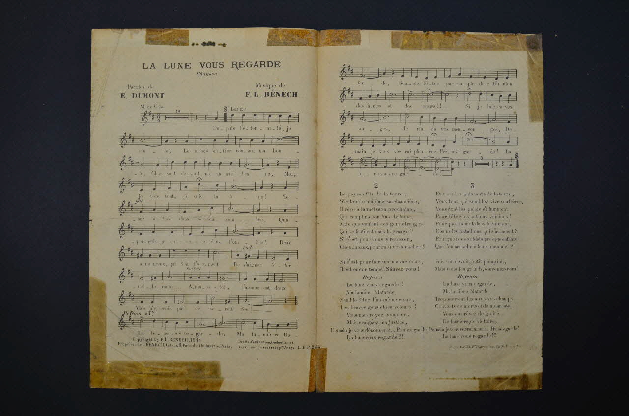 Feuillet rectangulaire en papier industriel imprimé. Le feuillet contient la partition et les paroles de la chanson. Au, dos, publicité pour l'éditeur.