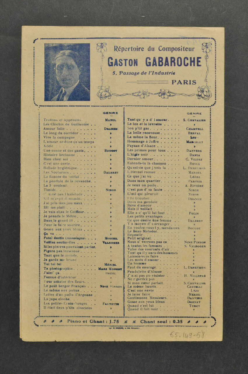 Les inscriptions renseignent le titre de la chanson, le nom des auteurs, de l'artiste et de l'éditeur. A l'intérieur, partitions et paroles de la chanson. Au dos, liste d?autres partitions publiées par l?éditeur.Décor
