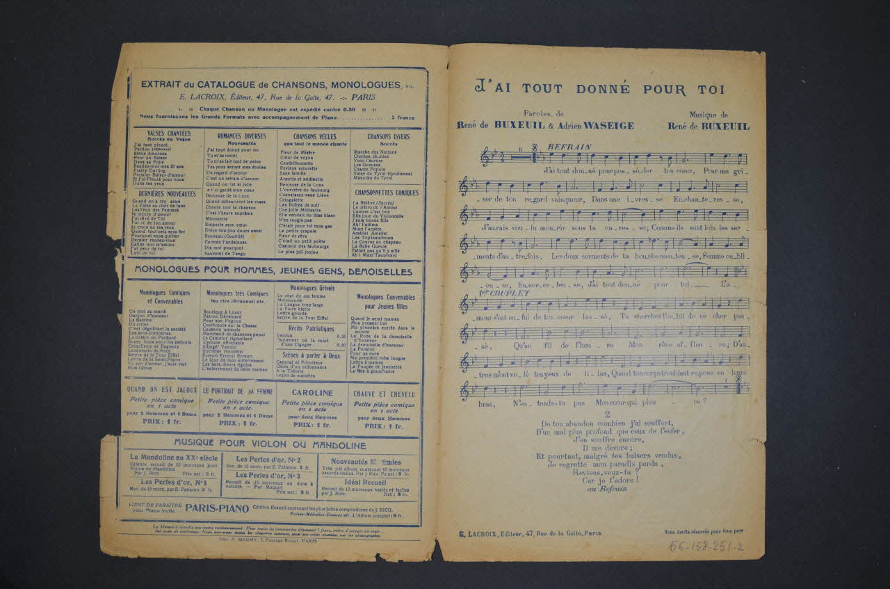 Sur la couverture, le portrait photographique de René de Buxeuil jouant du piano. Les inscriptions renseignent le titre de la chanson, le nom des auteurs, de l'artiste et de l'éditeur. A l'intérieur, liste d'autres partitions publiées par l'éditeur et partition et paroles de "J'ai tout donné pour toi". Au dos, partition et paroles de "Vous n'aurez pas toujours vingt ans".Décor