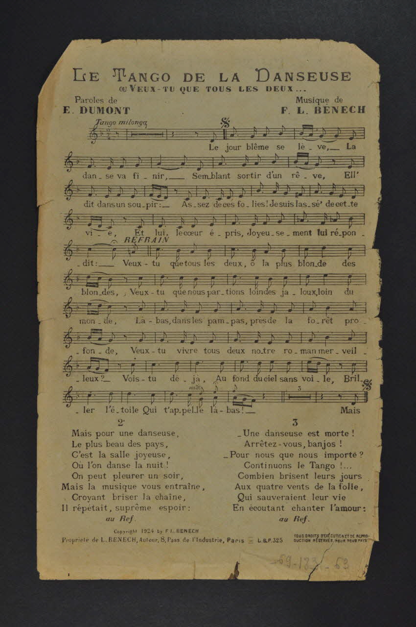 Des inscriptions renseignent le titre, les auteurs, les exécutants et l'éditeur. Au dos, la partition et les paroles de la deuxième chanson.Matériaux et techniques