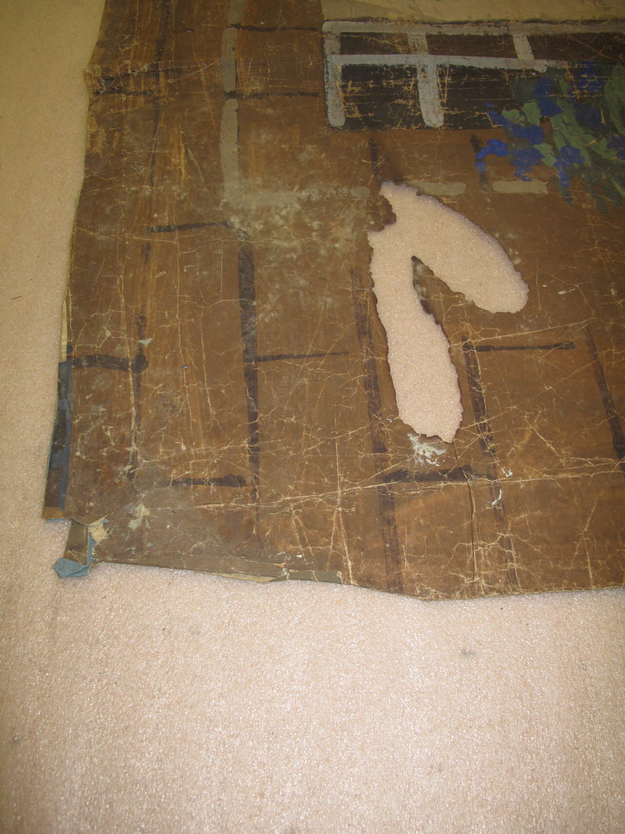 papier peint à la colle, collé sur plusieurs couches de papier / toile de fond, pour "le pays des ventrus" (auberge à gauche, paysage)Matériaux et techniques