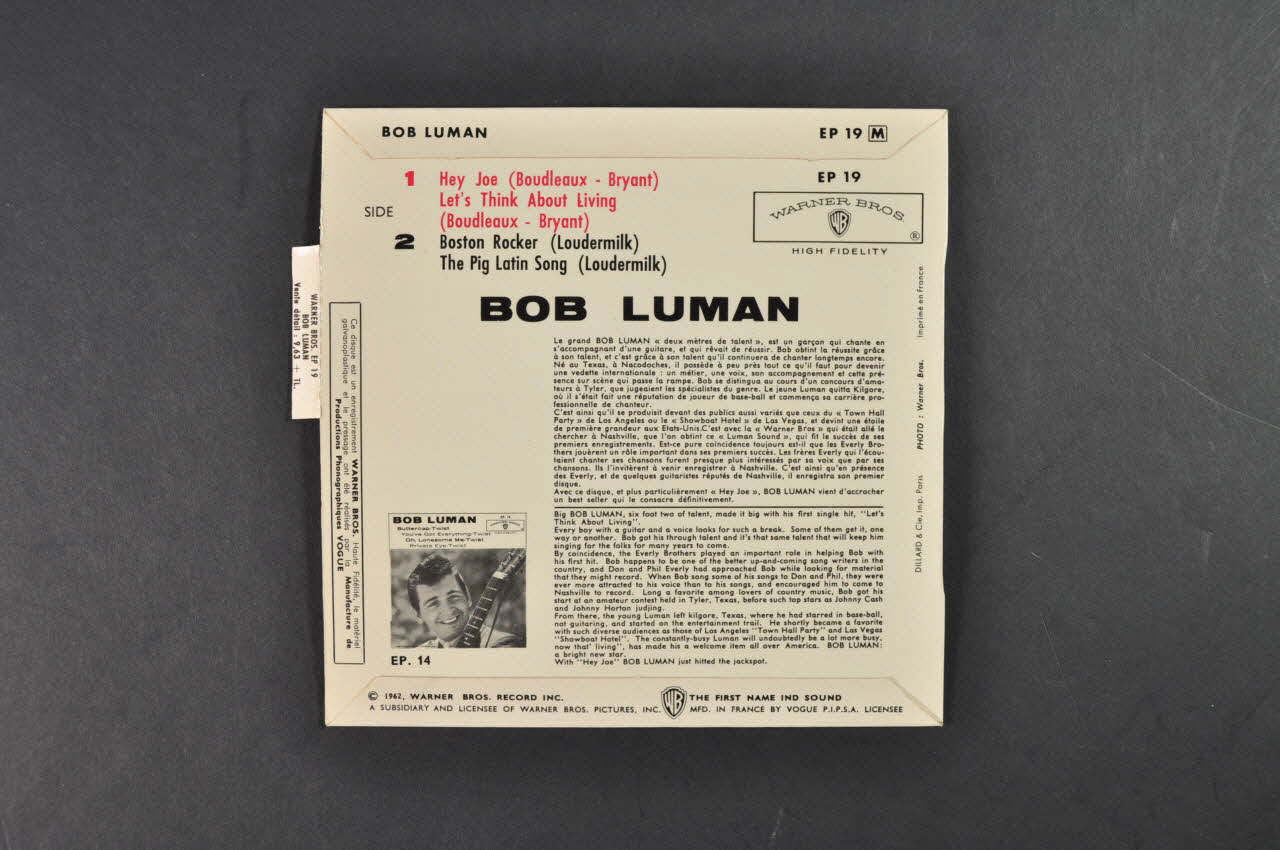 Le verso comporte le nom de l'artiste, les titres des chansons, le logo de l'éditeur ainsi que d'autres inscriptions et une photographie noir et blanc d'un autre disque de l'artiste sur fond blanc. Un onglet blanc contenant une inscription noire figure le long de la bordure gauche.