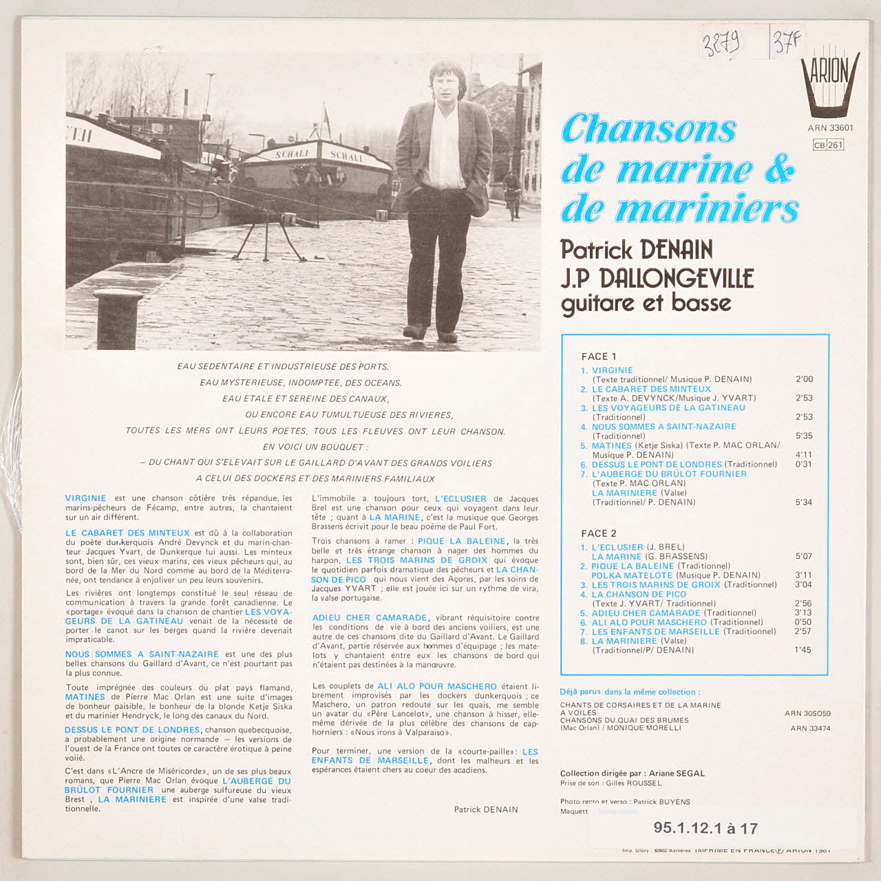disque 33 tours, Nous sommes à Saint-Nazaire, Pique la baleine, VIRGINIE, Matines, L'auberge du brûlot fournier. La marinière, Les trois marins de Groix, La marinière, Chansons de marine et de mariniers, Ali alo pour maschero, Adieu cher camarade, Dessus le pont de Londres, Le cabaret des minteux, L'éclusier, Les enfants de Marseille, La chanson de Pico, Les voyageurs de la Gatineau