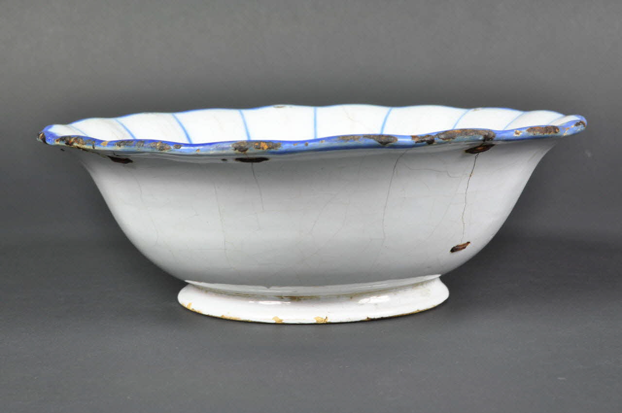 Faïence émaillée, décor au pinceau / Bord haut évasé et chantourné, godronné à l'intérieur. Décor peint en bleu sur fond clair. Filet sur le pourtour avec nervures verticales entre les godrons, évoquant des pétales de fleurs. Au centre le coeur : semis de points. Piedouche avec deux trous de suspension.Décor