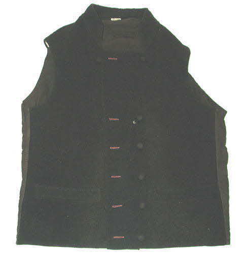 Tissu de laine, foulé, teint; à partie postérieure en coton sergée-croisée; à doublure en toile de lin ou de chanvre. / Encolure carrée assimilée, sans col, sans manches, ouverture partant de l'encolure et créant dissymétrie composée de deux rangées de cinq boutons. Possédant deux poches. Dos en coton marron. Face en laine doublée de lin.Matériaux et techniques