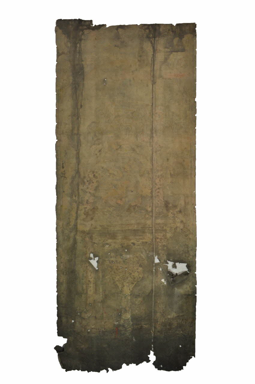 Cette toile de coton de format rectangulaire est peinte à la colle et se lit verticalement. Deux morceaux sont cousus dans la hauteur ; la couture est visible dans la partie gauche.